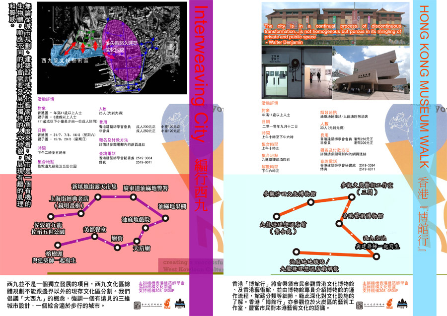 - 「編行西九」建築文化導賞行(7月底至八月底),傳達社會發展與文化保育可並存的訊息,讓市民對西九文化區發展計劃作出